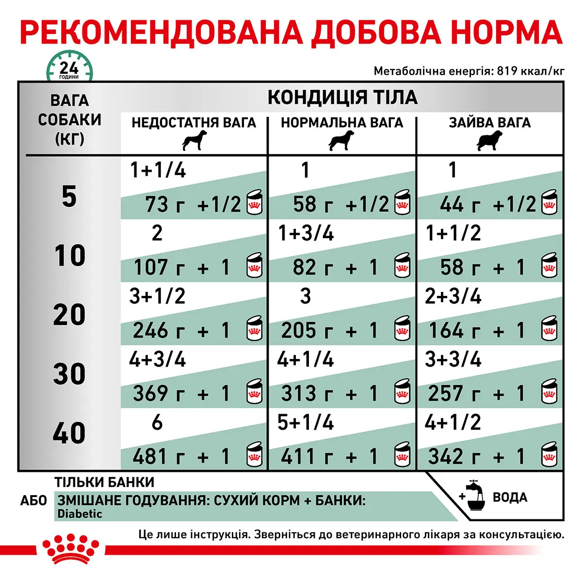 DIABETIC рекомендується застосовувати як ветеринарну дієту для пацієнтів з діагностованим цукровим діабетом, поки не буде досягнуто контролю клінічних ознак та гіперглікемії. Увага! При годуванні раціоном DIABETIC у собак значно підвищується чутливість до інсуліну. На початку застосування дієти рекомендується контролювати рівень глюкози в крові для корекції дози інсуліну. Перед початком та/або продовженням використання дієти потрібна консультація ветеринарного лікаря. Початковий курс вживання сухого корму DIABETIC: 6 місяців. Пам’ятайте, що тварині слід забезпечити постійний доступ до питної води.